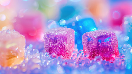 A captivating scene of colorful candy cubes splashing into water, surrounded by sugar sprinkles and bubbles, creating a playful and vibrant composition.