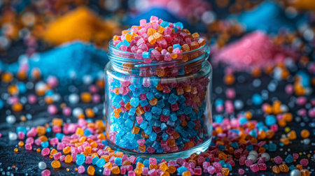 baking decorations, vibrant sugar pellets in a glass jar, sit on the kitchen counter, adding sweetness to desserts and serving as a colorful baking adornment