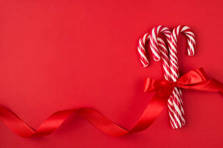 Christmas celebration striped red and white hard candies on red backgraund. Flat lay style.