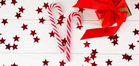 Christmas candy cane on white wood background, Christmas decors red gift boxes.