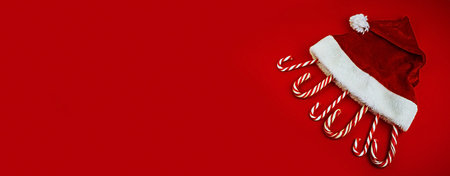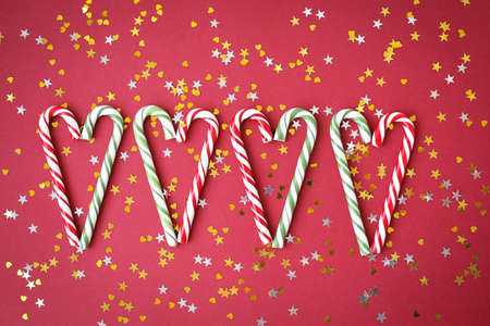 Christmas background with candy canes. Red sweet sticks with small stars. Flat lay, overhead view. Poster, banner, greeting card template. Festive backdrop. Holiday season