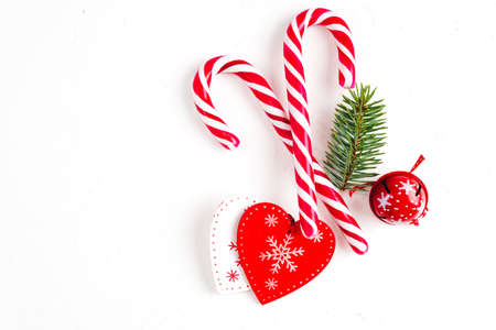 Christmas red toys and lollipops, pine cones and snowflakes, red berries on white background, top view, copy space. Christmas and New Year concept.