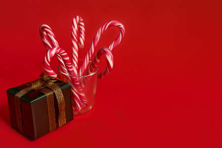 Christmas decoration for advertisement. Shiny present in glitter green wrapping paper with golden bow near glass with striped lollipops, isolated over red background with copy space