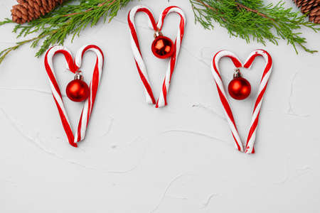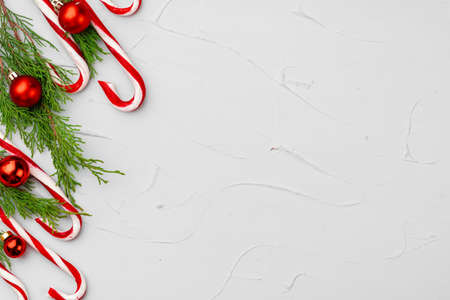 Christmas festive concept, A lot of traditional New Year sweets candy cane on a white marble table. Background, Top view copy space