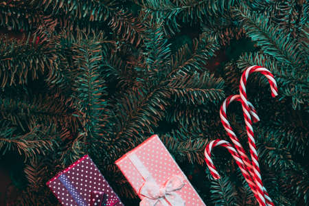 Winter holidays. Flat lay of striped candy canes and gift boxes on green fir tree branches.
