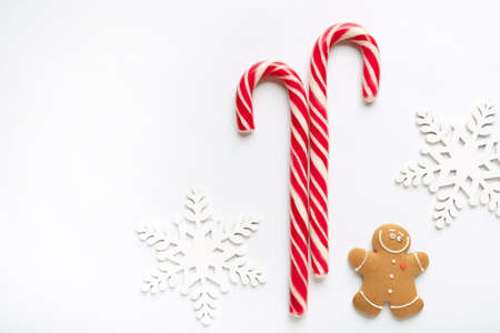 Christmas composition made of snowflakes gingerbread man cookies and candy on white background. Winter holidays concept. Flat lay, top view, copy space