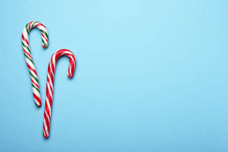 Tasty candy canes on light blue background, flat lay. Merry Christmas and Happy New Year