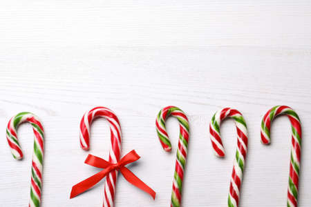 Sweet Christmas candy canes and one with bow on white wooden table, flat lay. Space for text