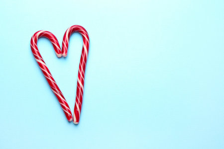 Heart made of tasty candy canes on light blue background, top view with space for text. Merry Christmas and Happy New Year