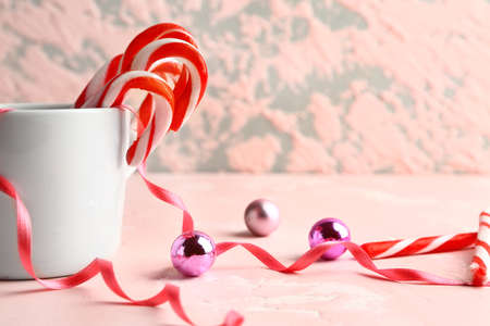 Mug with Christmas candy canes on table