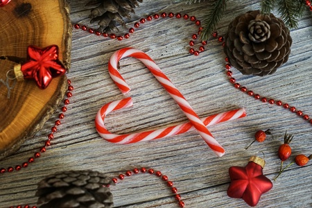 Red and white candy canes forming a heart on a background of dark wooden planks. Close up. Christmas photo