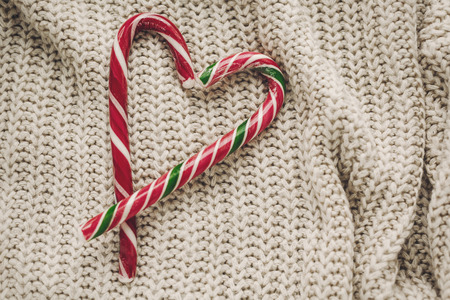 stylish christmas flat lay. peppermint candy cane in heart shape on rustic knitted sweater background top view. space for text. seasonal greetings, happy valentine day