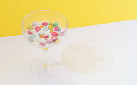 A sweet cocktail of coloured chocolate candies with milk the glass on a combination of yellow and white background. Minimal style. Food and drink concept.