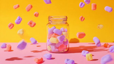 A delightful array of colorful candies spills from a glass jar, creating a cheerful scene filled with vibrant treats. Perfect for capturing the joy of sweets and celebrations.