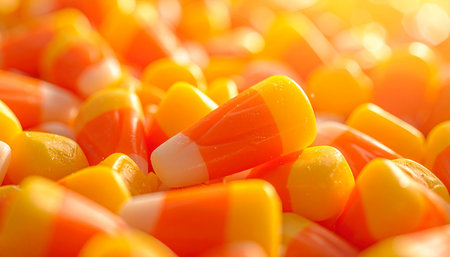 A mesmerizing macro shot of colorful Halloween candy corn, capturing the essence of festive sweets and Halloween treats.