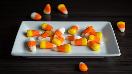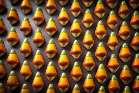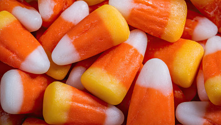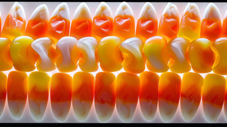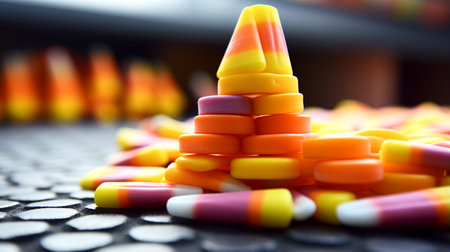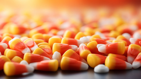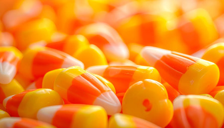 Explore the vibrant colors of Halloween candy corn with this captivating macro photography, a delightful addition to your sweet treat collection.