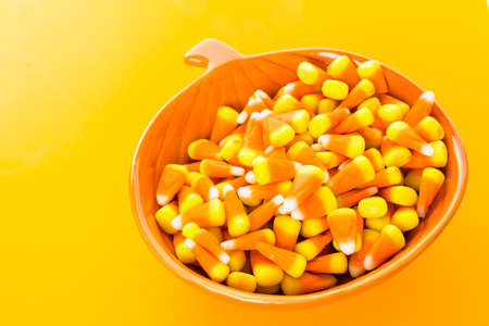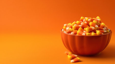 Bowl of vibrant Candy Corn on an orange background, perfect for Halloween and festive occasions. Sweet and colorful treat