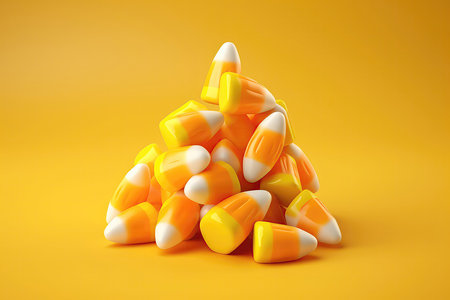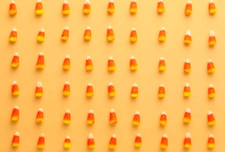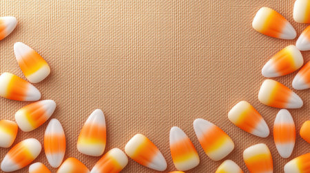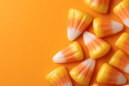 A vibrant arrangement of classic candy corn pieces set against a bright orange background, perfect for Halloween-themed designs or festive culinary projects.