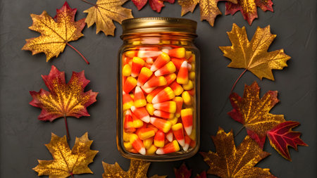 Bright candy corn fills a glass jar, surrounded by vibrant autumn leaves on a dark surface.