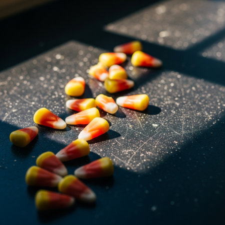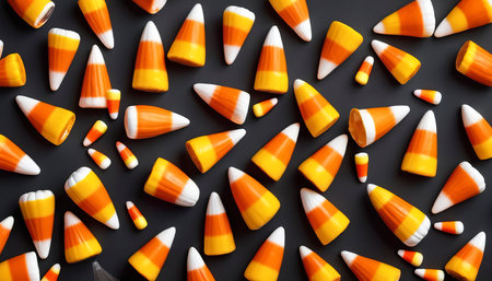 Clusters of vibrant candy corn in shades of yellow, orange, and green create a playful and festive arrangement against a shadowy backdrop, capturing the spirit of autumn celebrations. Their unique triangular shapes highlight the joyous and nostalgic essence of seasonal treats.
