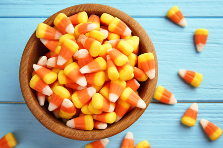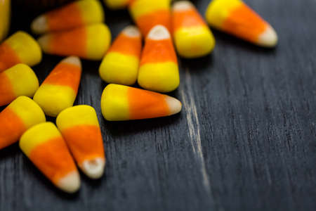 Colorful Halloween candy corns on wooden background