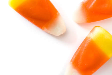 Candy corn is a small, pyramid shaped candy, divided into three sections of different colors, with a waxy texture and a flavor based on honey, sugar, butter, and vanilla. Isolated on white background