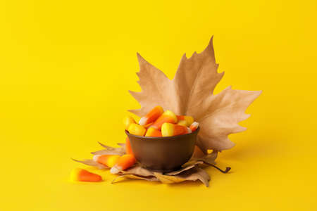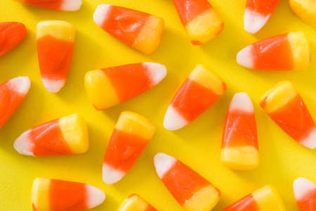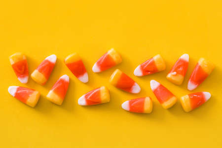 Typical halloween candy corn on yellow background. Top view