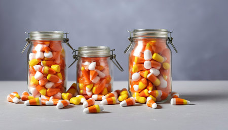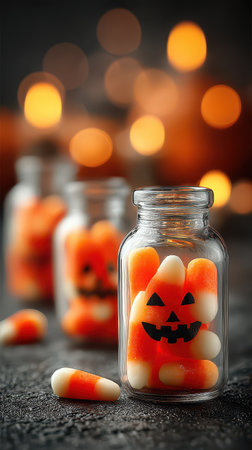 Bright orange and white candy is arranged in jars with playful pumpkin faces. Soft lights create a festive atmosphere for Halloween.