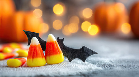 Three pieces of candy corn, with orange and yellow stripes, sit on a textured surface. A small black bat decoration is situated beside them. The background features out-of-focus pumpkins and warm, yellow and orange lights.