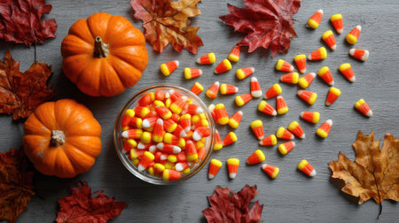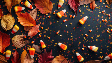 A captivating arrangement of candy corn surrounded by vibrant autumn leaves, creating a perfect seasonal decoration that embodies the spirit of fall festivities.