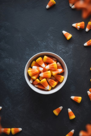 AI Generated. Bowl of candy corn on dark texture background copy space for text top view