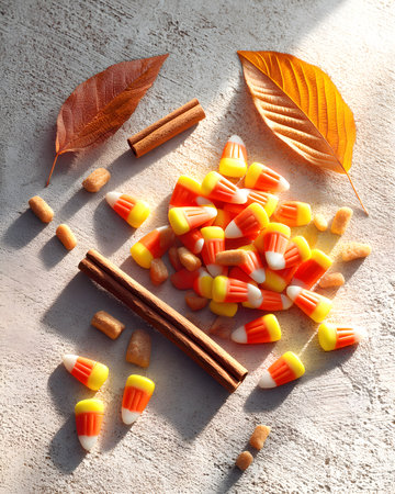 This image showcases a rich arrangement of colorful candy corn on a textured background, evoking a warm and festive autumn atmosphere perfect for celebrations.