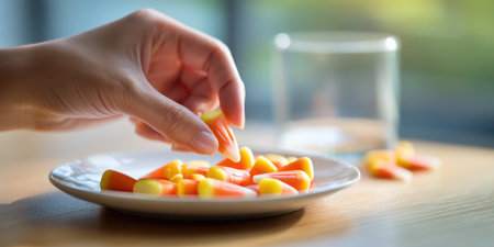 Candy corn on white plate with hand picking one piece in soft natural light