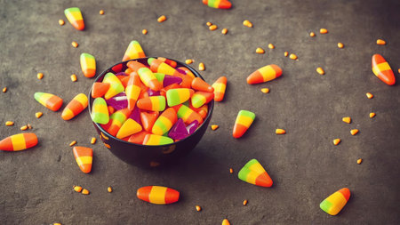 Colorful candy corn chaos captured in playful scene with blurred background and copy space for text