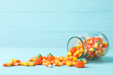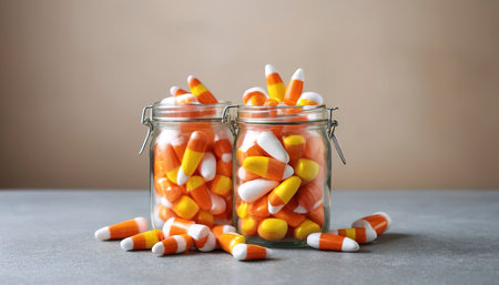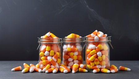 Halloween candy candycorn in two jars copy space