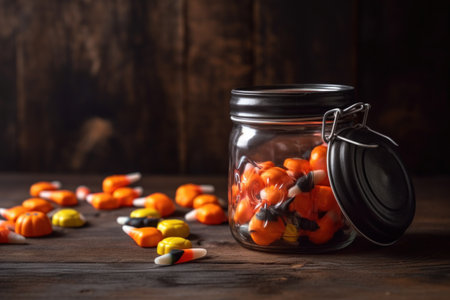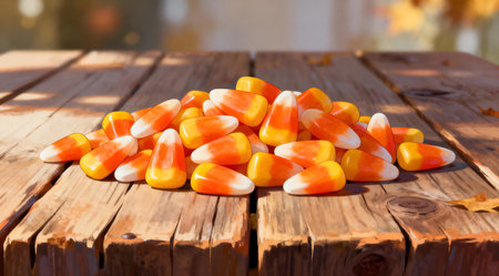 A vibrant mound of candy corn in shades of orange, yellow, and white is displayed on a weathered wooden surface. The autumnal arrangement captures the festive spirit with natural lighting enhancing the warm tones of the candy and wood. Ideal for seasonal decorations or themed party invitations. AI-generated illustration.