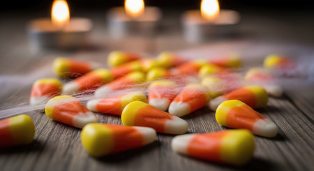 Close up of candy corn with candles and spider web on a wooden table. The image captures the essence of Halloween with its festive treats and decorations.