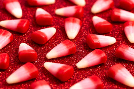 Red Pink and White Valentines Day Candy Corn on a Glittering Red Background
