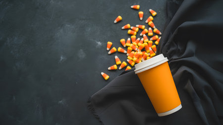 A vibrant orange cup spills a cascade of candy corn onto a dark, textured fabric surface, creating a festive Halloween scene.