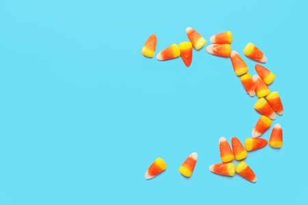 Bunch of candy corn sweets as sybol of Halloween hoiday on textured background with a lot of copy space for text. Flat lay composition for all hallows eve. Top view shot.