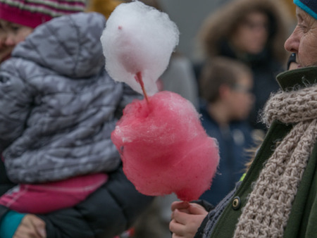 Jozefow, Poland - November 11, 2018: Children with white and red cotton candy in the colors of the polish flag. Celebration of 100 anniversary of Polish independence. Poland