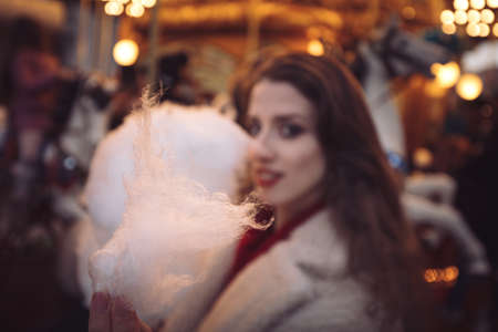 Portrait of a beautiful young girl with white cotton candy in front of a carousel horse