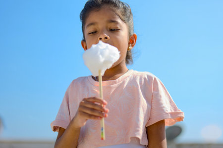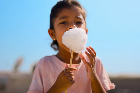 Young girl enjoying a sweet treat on a sunny day. Pure joy captured in this candid moment.