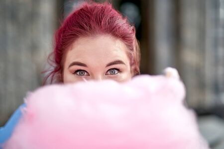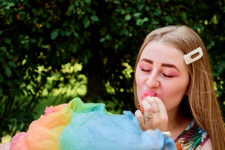 Cheerful girl eating cotton candy. Girl with cotton candy. Rest in the amusement park
