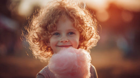 A child with curly hair smiles while holding pink cotton candy. Warm sunlight shines down as the kid enjoys the treat in a park setting. This moment captures pure joy in nature.