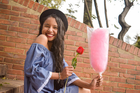 A young, beautiful and in love young girl with a dress of bare shoulders and a fedora hat just received a red rose and a cotton candy. She is very happy and radiant with joy.