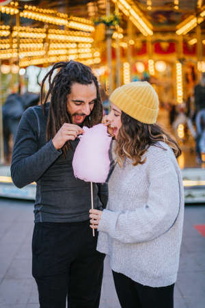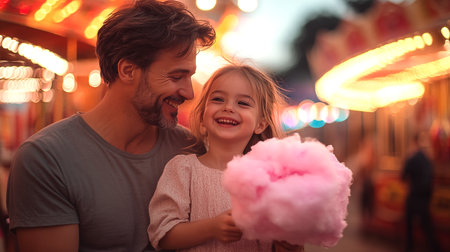 Cute little girl and her handsome dad with cotton candy in amusement park