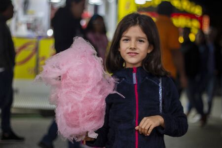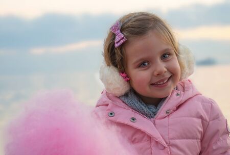 Sweet smiling little girl with Pink Cotton candy smiling outdoors