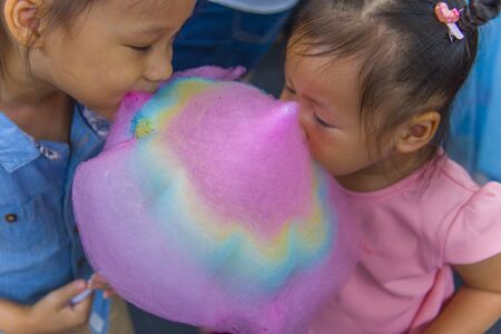 Happy children boy and girl brother and sister eating cotton candy.