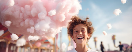 Young boy smiling with cotton candy on his face at amusement park. Concept Family Day Out, Candy Fun, Sweet Treats, Happy Moments, Childhood Joy